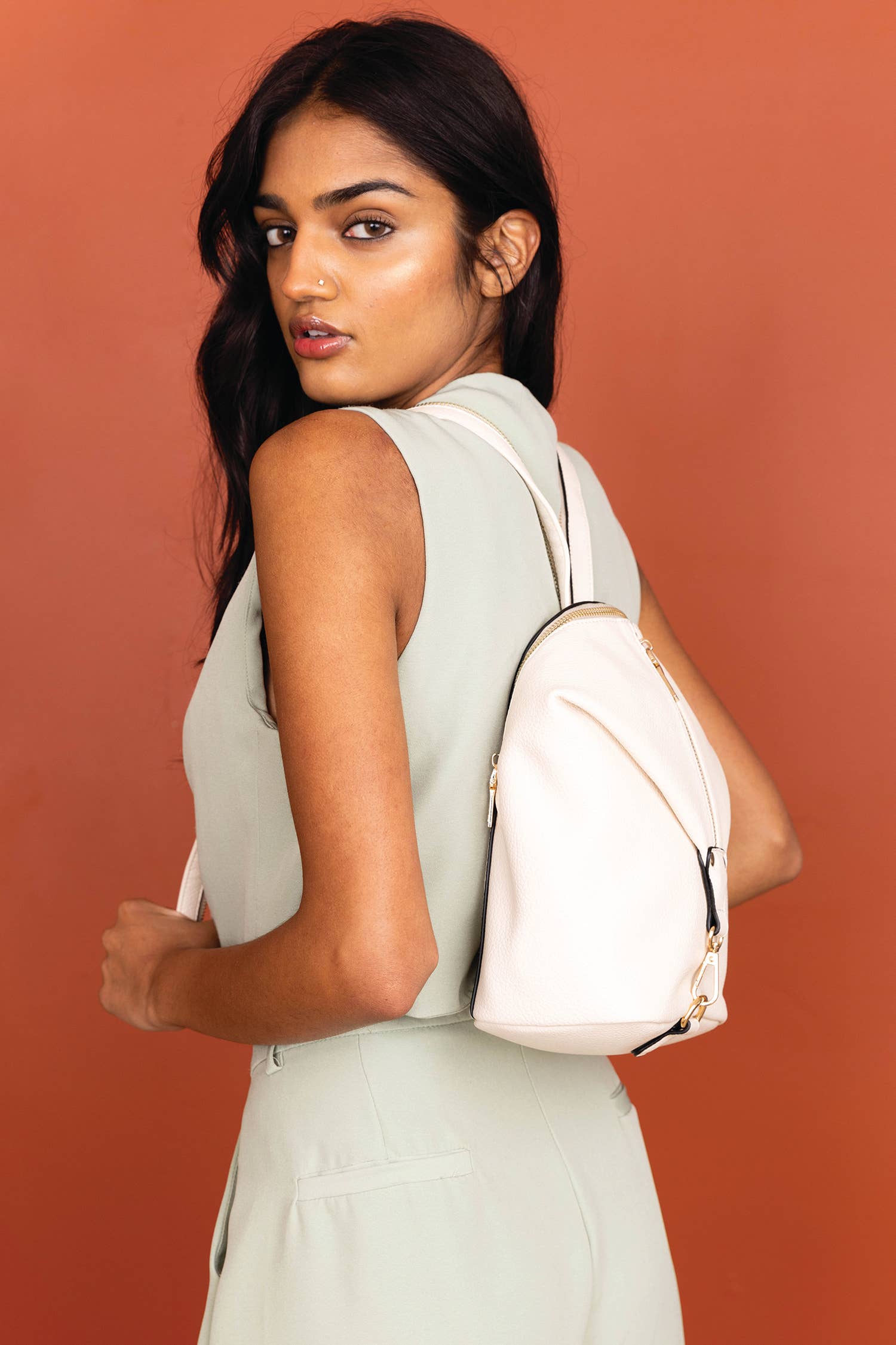 The BP2465 Linnette Foldover Clasp Backpack offers sleek versatility and functionality. With a convertible foldover clasp and double zip opening, it effortlessly switches between backpack and sling styles while providing easy access to belongings. Finished with gold or silver-tone hardware, it exudes elegance. Crafted from vegan leather, it aligns with ethical values. Perfect for everyday use and back-to-school needs.