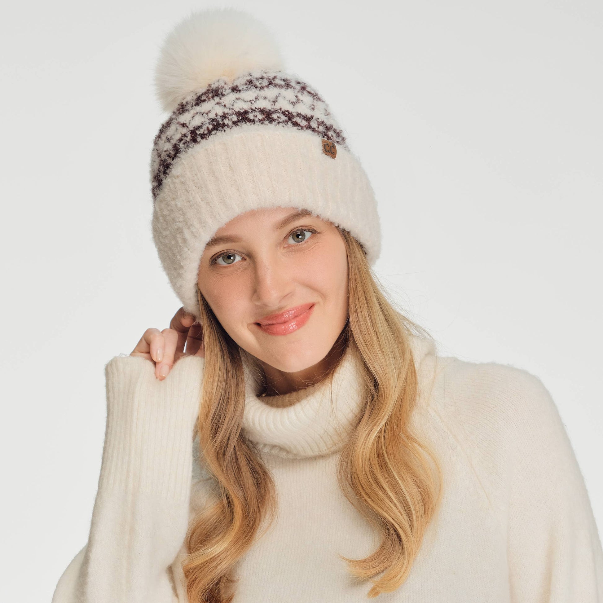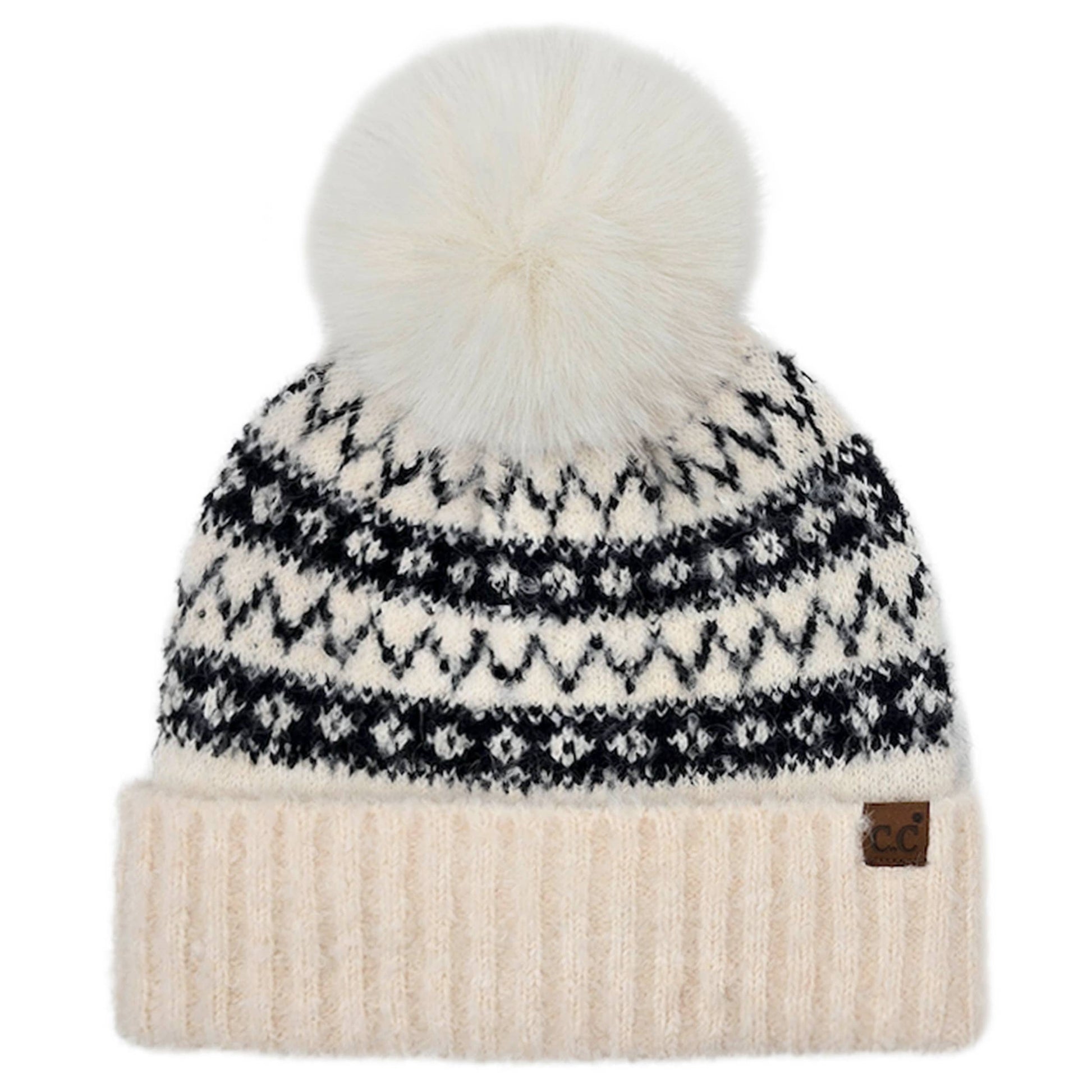 C.C Fair Isle with Solid Faux Fur Pom Beanie Hat Winter Hat