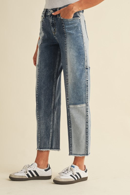 Comfort Stretch Frayed Hem Patchwork Slim Barrel Leg Cropped Jeans