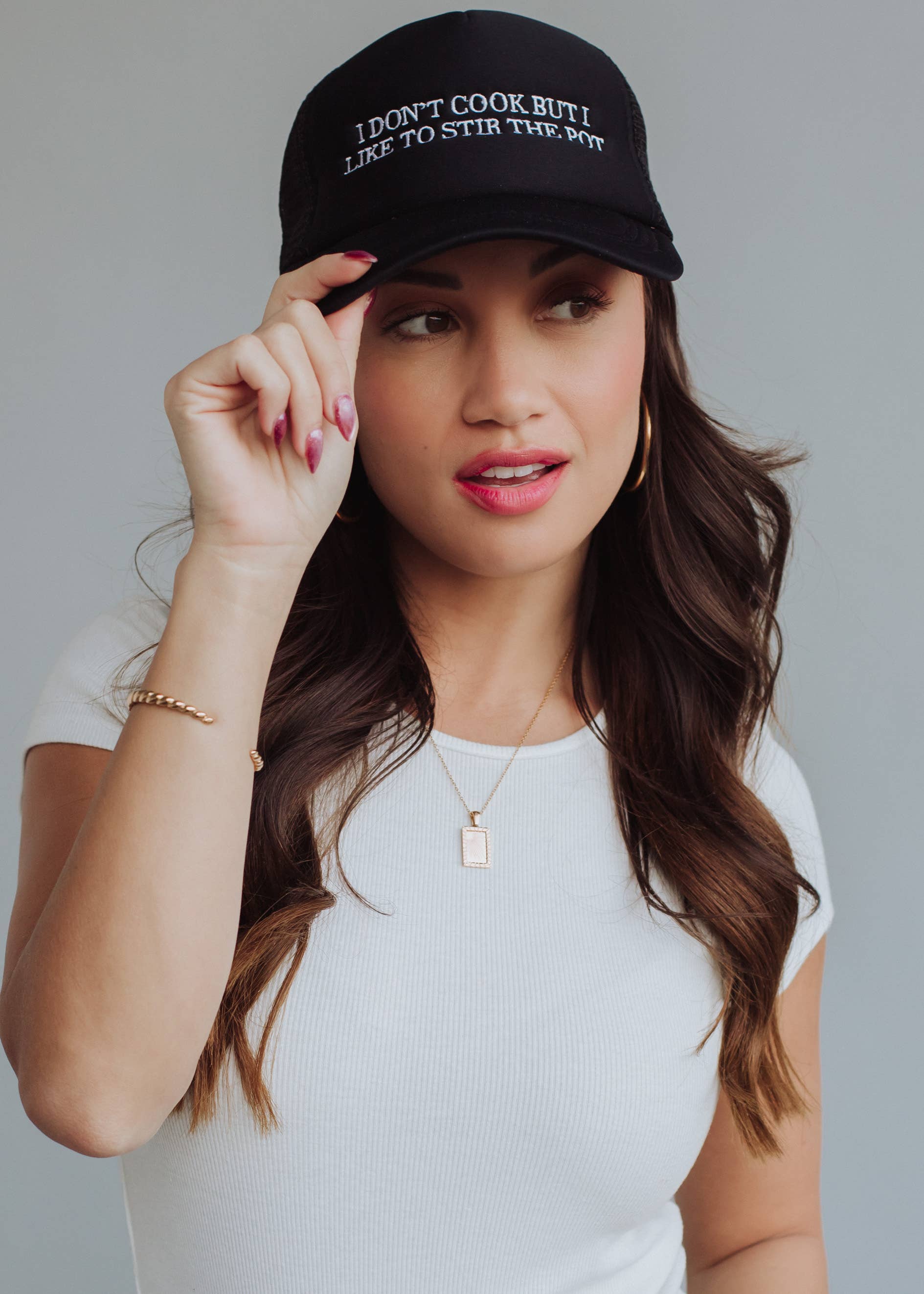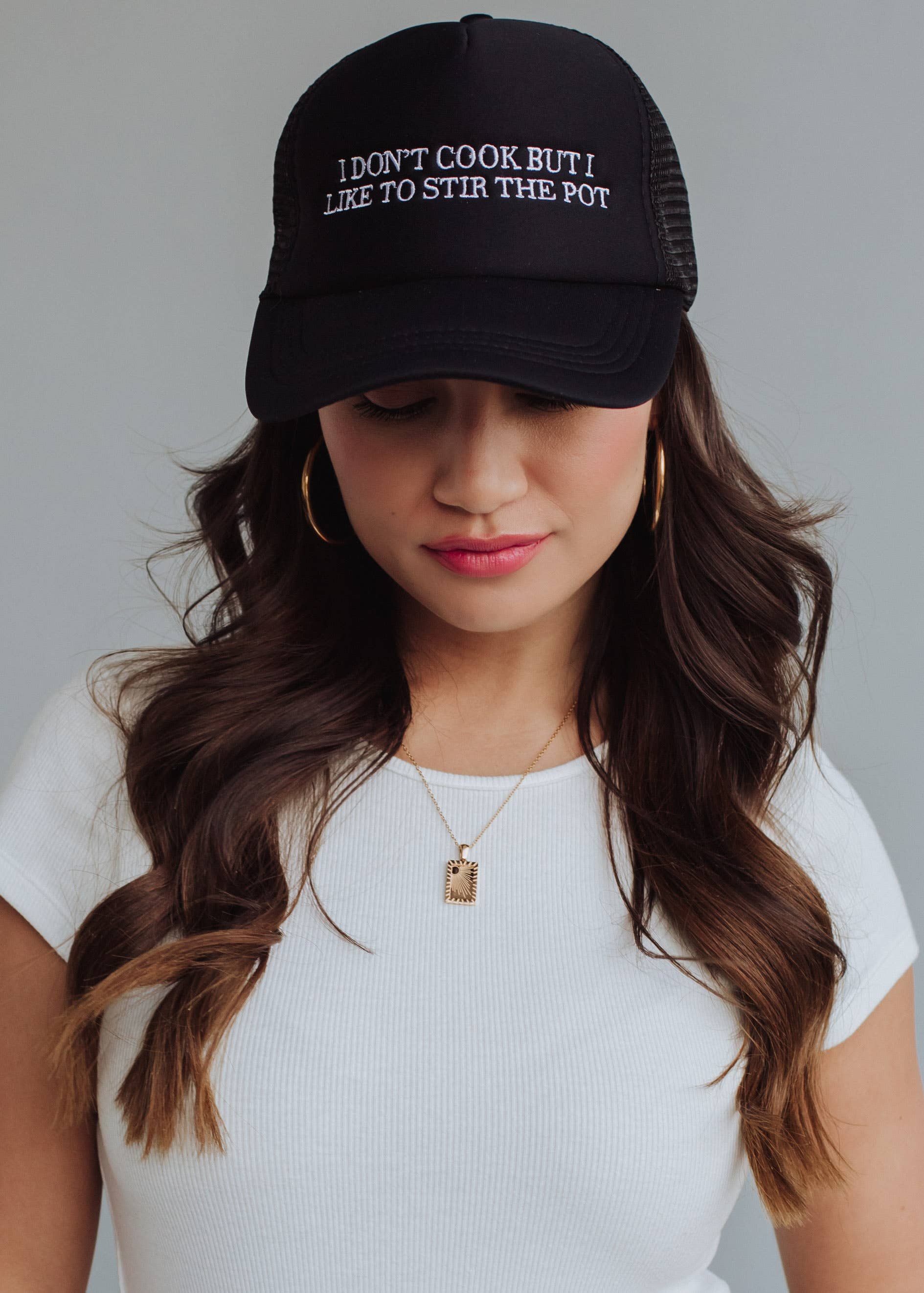 Black trucker hat White embroidered "I don't cook but I like to stir the pot"