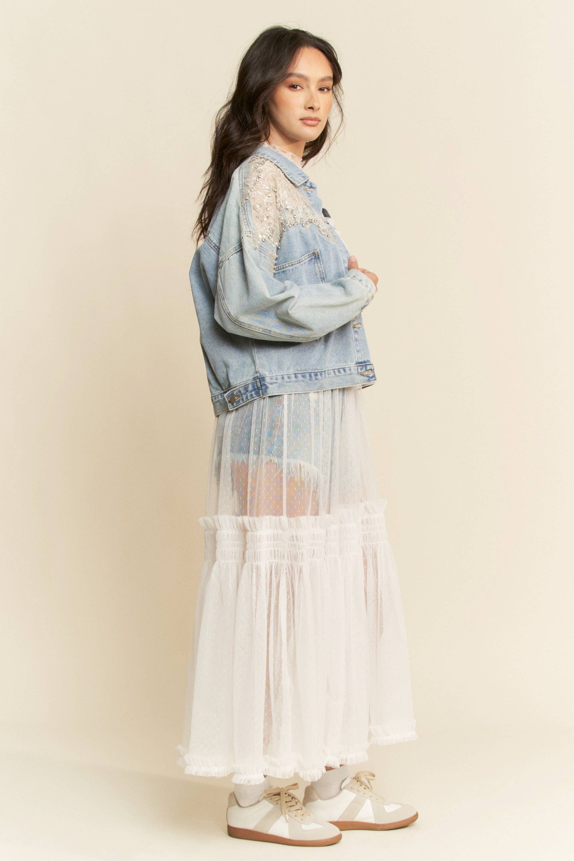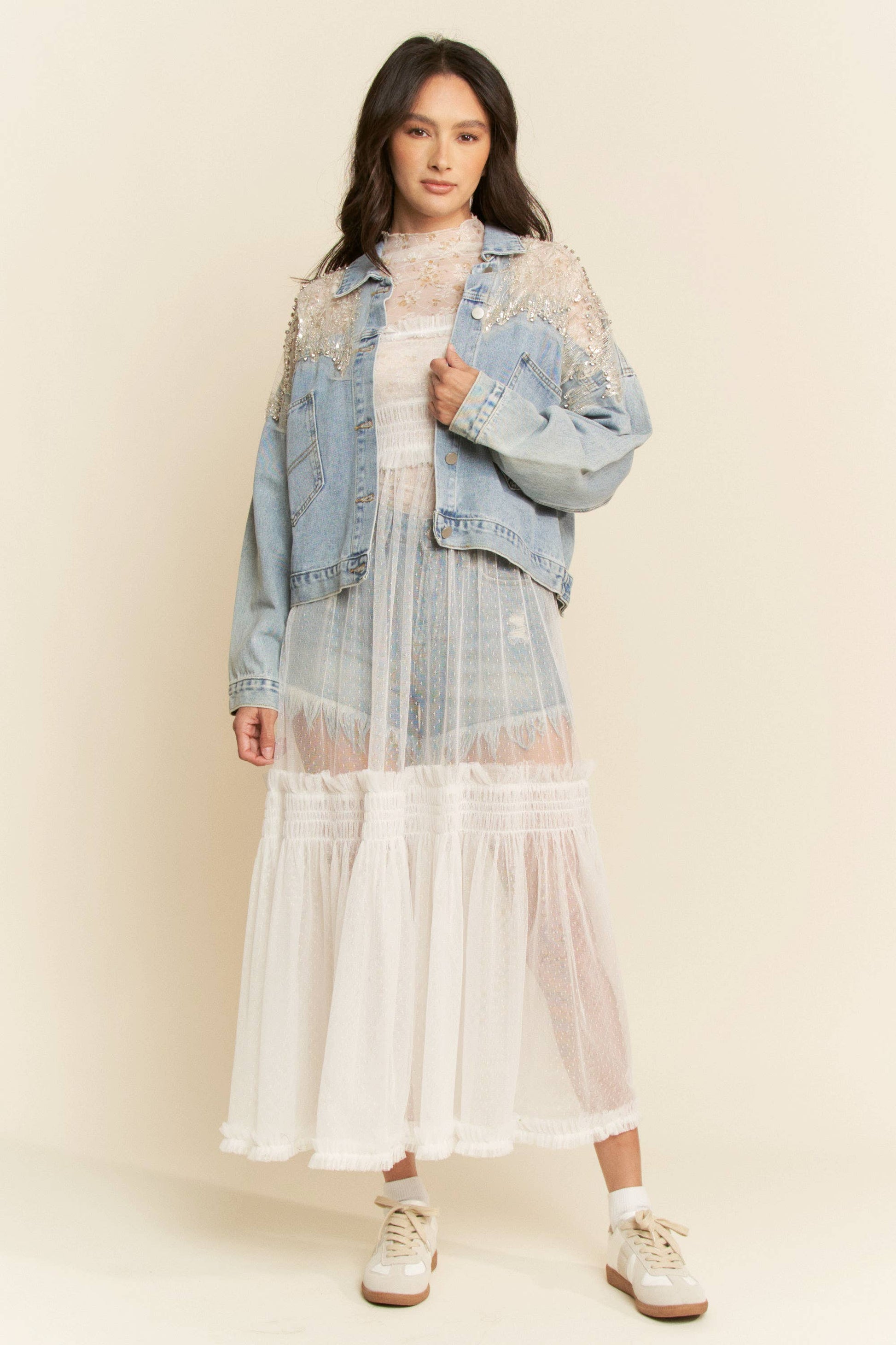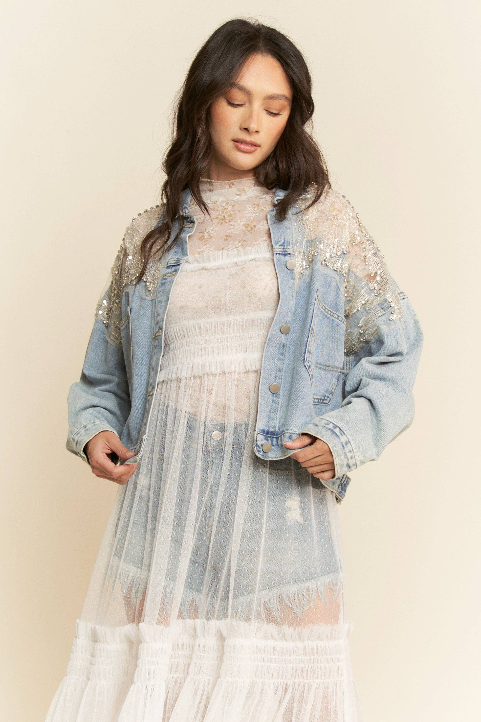 Absolutely Gorgeous Statement Denim Jacket!! Mesh Lace with Sequin Accents. Button Front. Oversized Fit.