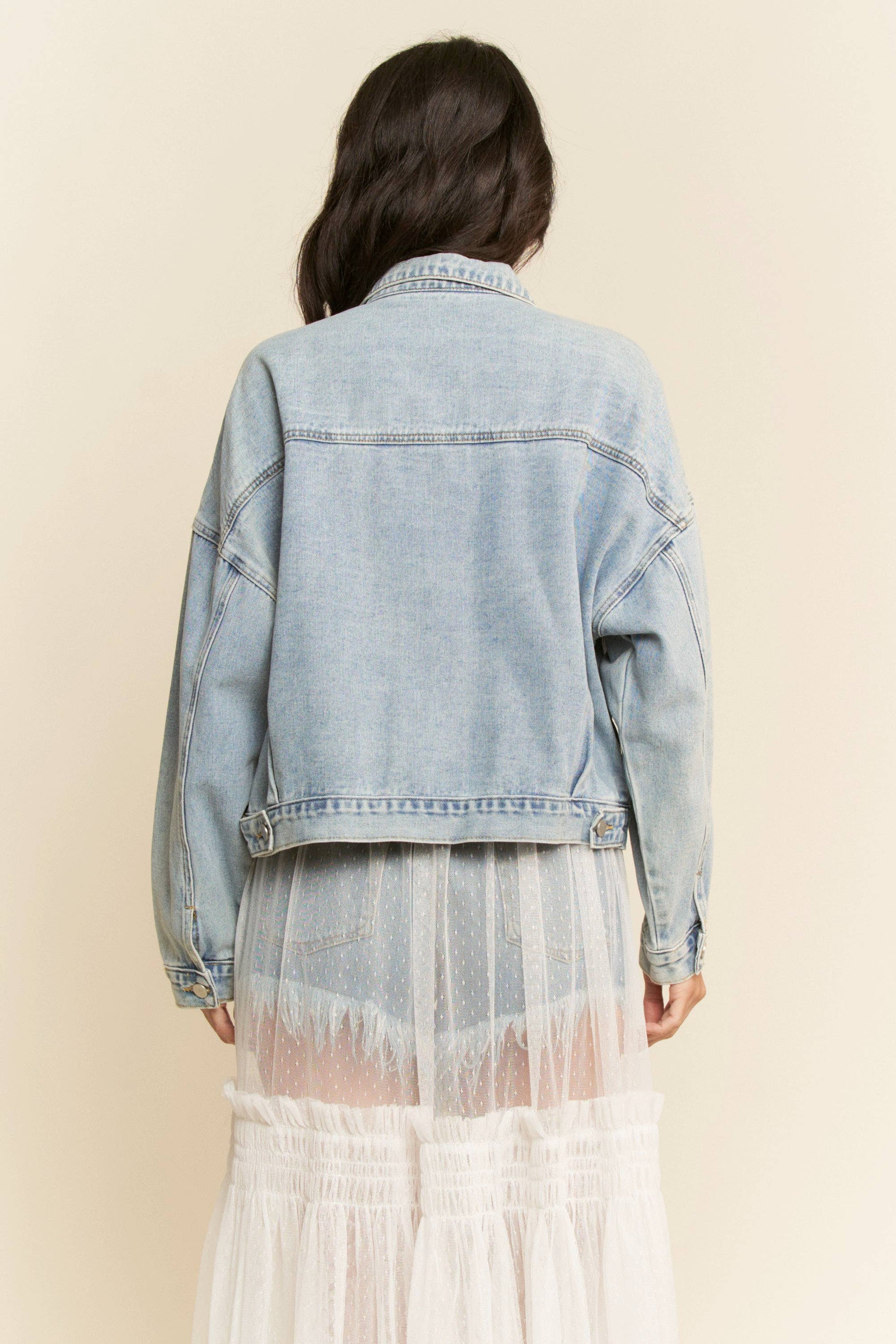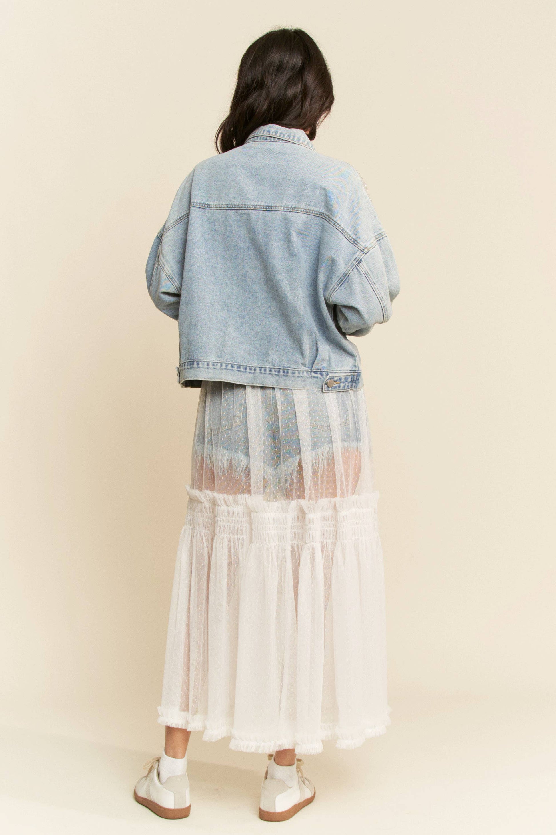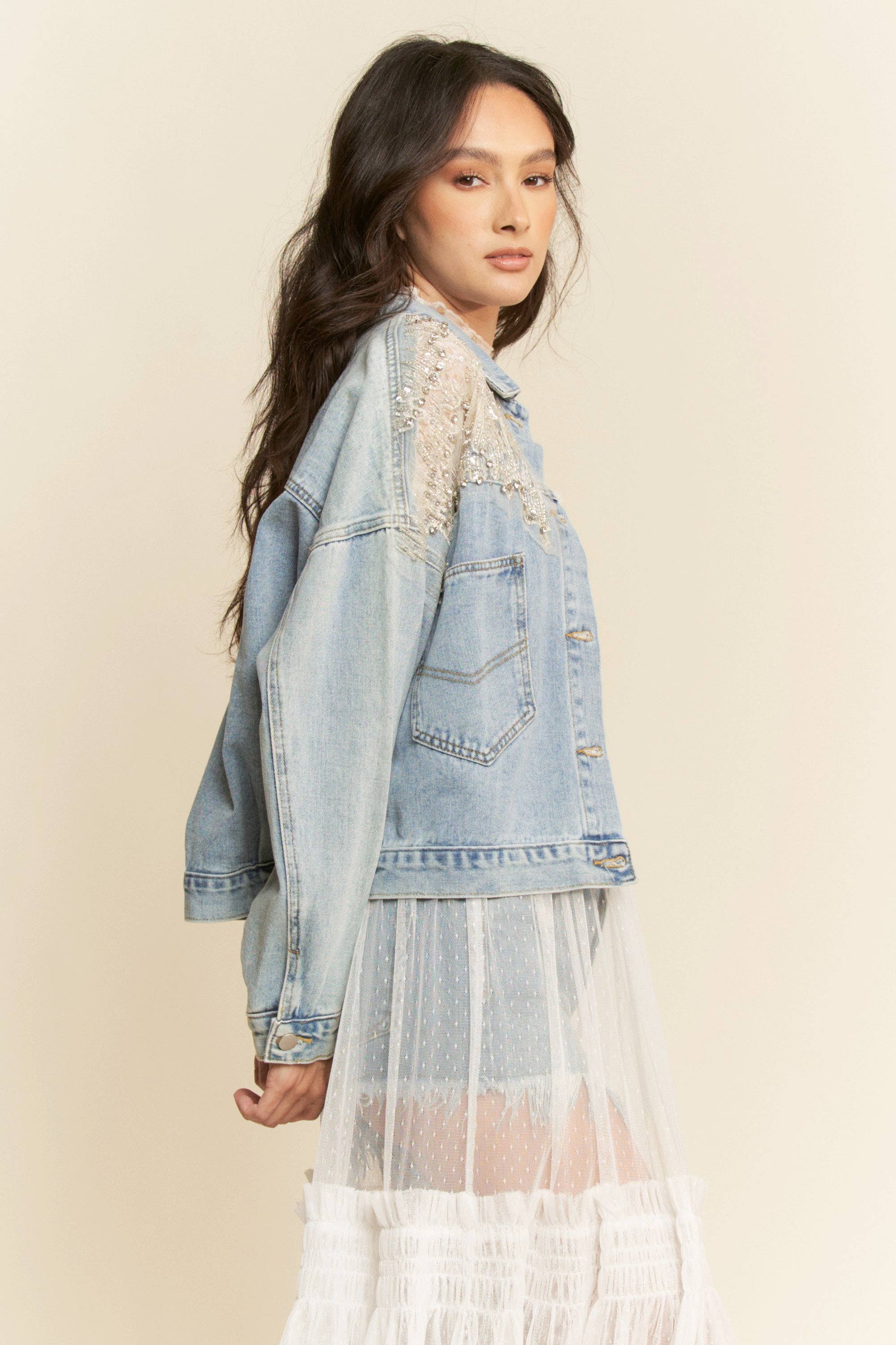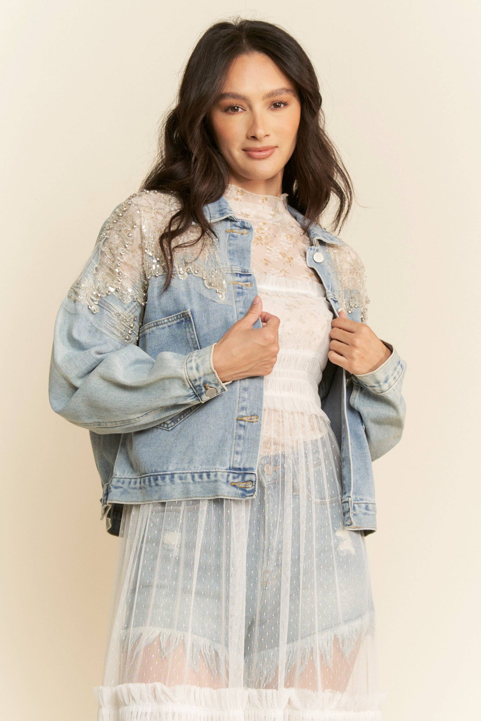 Absolutely Gorgeous Statement Denim Jacket!! Mesh Lace with Sequin Accents. Button Front. Oversized Fit.