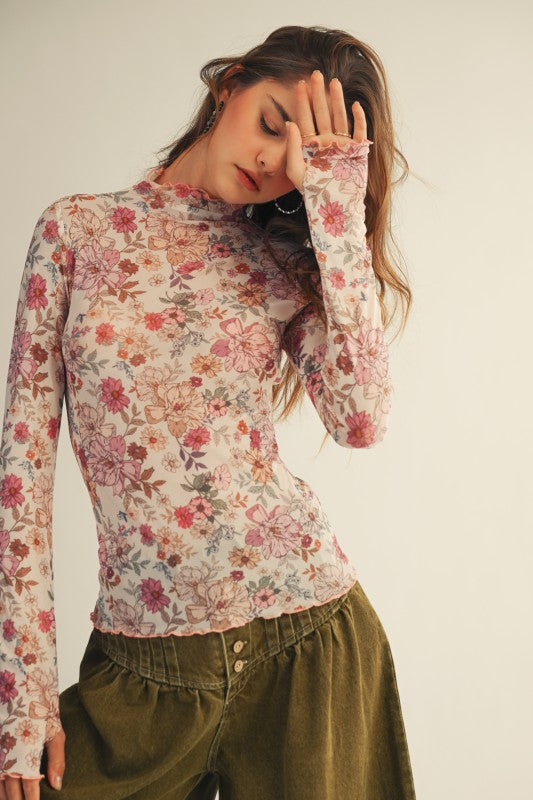 Floral Mesh Layering Top with Thumb Holes. Full Length. Soft & Stretchy.