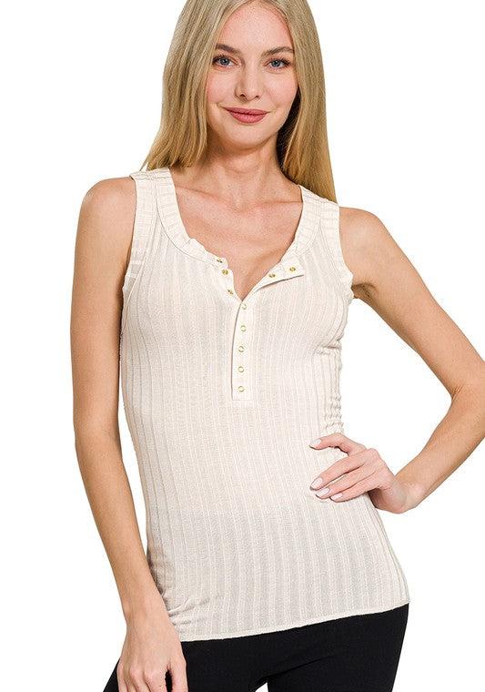 WASHED RIBBED SCOOP NECK HENLEY TANK TOP