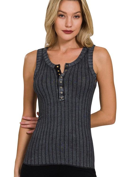 WASHED RIBBED SCOOP NECK HENLEY TANK TOP